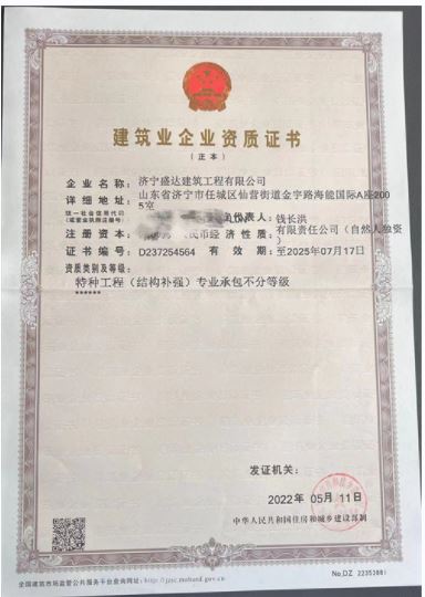 濟(jì)寧盛達(dá)建筑工程有限公司是濟(jì)寧市具有加固工程專(zhuān)業(yè)承包、建筑工程裝飾專(zhuān)業(yè)承包資質(zhì)建筑企業(yè)。